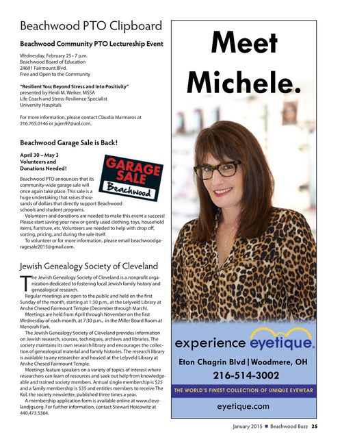 Wednesday, February 25 • 7 p.m. Beachwood Board of Education 24601 Fairmount Blvd. Free and Open to the Community “Resilient You: Beyond Stress and Into Positivity” presented by Heidi M. Weiker, MSSA Life Coach and Stress-Resilience Specialist University Hospitals For more information, please contact Claudia Marmaros at 216.765.0146 or jujen97@aol.com.