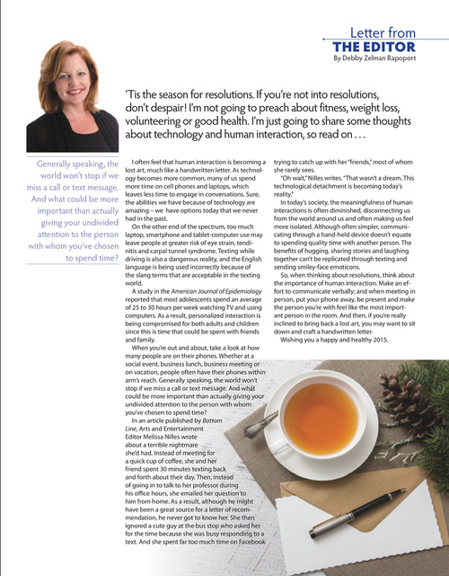 I often feel that human interaction is becoming a lost art, much like a handwritten letter. As technology becomes more common, many of us spend more time on cell phones and laptops, which leaves less time to engage in conversations. Sure, the abilities we have because of technology are amazing – we have options today that we never had in the past. On the other end of the spectrum, too much laptop, smartphone and tablet-computer use may leave people at greater risk of eye strain, tendinitis and carpal tunnel syndrome. Texting while driving is also a dangerous reality, and the English language is being used incorrectly because of the slang terms that are acceptable in the texting world. A study in the American Journal of Epidemiology reported that most adolescents spend an average of 25 to 30 hours per week watching TV and using computers. As a result, personalized interaction is being compromised for both adults and children since this is time that could be spent with friends and family. When you’re out and about, take a look at how many people are on their phones. Whether at a social event, business lunch, business meeting or on vacation, people often have their phones within arm’s reach. Generally speaking, the world won’t stop if we miss a call or text message. And what could be more important than actually giving your undivided attention to the person with whom you’ve chosen to spend time? In an article published by Bottom Line, Arts and Entertainment Editor Melissa Nilles wrote about a terrible nightmare she’d had. Instead of meeting for a quick cup of coffee, she and her friend spent 30 minutes texting back and forth about their day. Then, instead of going in to talk to her professor during his office hours, she emailed her question to him from home. As a result, although he might have been a great source for a letter of recommendation, he never got to know her. She then ignored a cute guy at the bus stop who asked her for the time because she was busy responding to a text. And she spent far too much time on Facebook trying to catch up with her “friends,” most of whom she rarely sees. “Oh wait,” Nilles writes. “That wasn’t a dream. This technological detachment is becoming today’s reality.” In today’s society, the meaningfulness of human interactions is often diminished, disconnecting us from the world around us and often making us feel more isolated. Although often simpler, communicating through a hand-held device doesn’t equate to spending quality time with another person. The benefits of hugging, sharing stories and laughing together can’t be replicated through texting and sending smiley-face emoticons. So, when thinking about resolutions, think about the importance of human interaction. Make an effort to communicate verbally; and when meeting in person, put your phone away, be present and make the person you’re with feel like the most important person in the room. And then, if you’re really inclined to bring back a lost art, you may want to sit down and craft a handwritten letter. Wishing you a happy and healthy 2015.