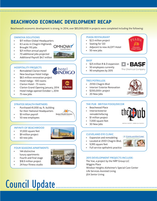 Beachwood's economic development is strong. In 2014, over $83,000,000 in projects were completed including the following: omnova solutions • $17 million Global Headquarters • 8.5 acres in Chagrin Highlands • Brought 110 jobs • $21 million annual payroll • 70 additional jobs projected • Additional Payroll: $4.7 million piada restaurant • $2.5 million project • Seating for 120 • Adjacent to new ALOFT Hotel • 50 new jobs