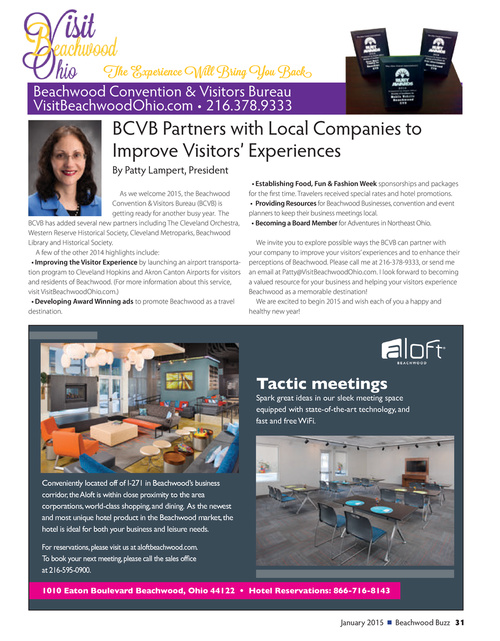 As we welcome 2015, the Beachwood Convention & Visitors Bureau (BCVB) is getting ready for another busy year. The BCVB has added several new partners including The Cleveland Orchestra, Western Reserve Historical Society, Cleveland Metroparks, Beachwood Library and Historical Society. A few of the other 2014 highlights include: • Improving the Visitor Experience by launching an airport transportation program to Cleveland Hopkins and Akron Canton Airports for visitors and residents of Beachwood. (For more information about this service, visit VisitBeachwoodOhio.com.) • Developing Award Winning ads to promote Beachwood as a travel destination. • Establishing Food, Fun & Fashion Week sponsorships and packages for the first time. Travelers received special rates and hotel promotions. • Providing Resources for Beachwood Businesses, convention and event planners to keep their business meetings local. • Becoming a Board Member for Adventures in Northeast Ohio. We invite you to explore possible ways the BCVB can partner with your company to improve your visitors’ experiences and to enhance their perceptions of Beachwood. Please call me at 216-378-9333, or send me an email at Patty@VisitBeachwoodOhio.com. I look forward to becoming a valued resource for your business and helping your visitors experience Beachwood as a memorable destination! We are excited to begin 2015 and wish each of you a happy and healthy new year!
