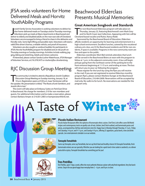 he next Beachwood Elderclass program will take place on Thursday, January 22, featuring Beachwood’s own Mark Grey and his North Coast Jazz Collectives. Appearing with him will be Cleveland based vocalist and flutist, Nancy Redd. Sponsored by the Beachwood Board of Education, Elderclass affords residents an opportunity for learning and entertainment in a high school environment. Excellent lunches, catered by the vocational culinary arts class, are $5 for Beachwood residents and $8 for non-residents, if space is available. Programs in the new community room are free and open to the public. Elderclass coordinator Mort Biel reminds attendees that lunch will be served in the Beachwood Bistro at noon with the program to follow at 1 p.m. in the adjacent community room. A bus will begin pickups going from the northeast corner of the parking lot to the front entrance beginning at 11:15 a.m. and ending at noon. The bus will return you to your car following the program. Please register for the lunch by using the flyer you will receive in the mail. If you are not registered to receive Elderclass monthly program flyers, please contact Marlene Dunger at the Beachwood Board of Education, 216.464.2600. Reservations will be accepted by mail only. No walk-ins for lunch. No reservations are needed for the program only.