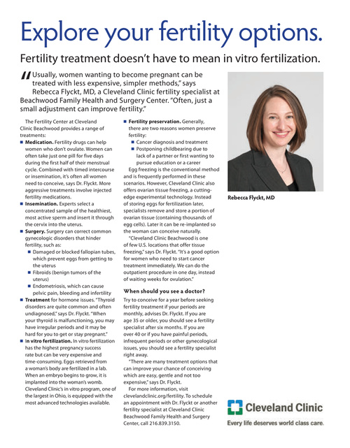 The Fertility Center at Cleveland Clinic Beachwood provides a range of treatments: Medication. Fertility drugs can help women who don’t ovulate. Women can often take just one pill for five days during the first half of their menstrual cycle. Combined with timed intercourse or insemination, it’s often all women need to conceive, says Dr. Flyckt. More aggressive treatments involve injected fertility medications. Insemination. Experts select a concentrated sample of the healthiest, most active sperm and insert it through the cervix into the uterus. Surgery. Surgery can correct common gynecologic disorders that hinder fertility, such as: Damaged or blocked fallopian tubes, which prevent eggs from getting to the uterus Fibroids (benign tumors of the uterus) Endometriosis, which can cause pelvic pain, bleeding and infertility Treatment for hormone issues. “Thyroid disorders are quite common and often undiagnosed,” says Dr. Flyckt. “When your thyroid is malfunctioning, you may have irregular periods and it may be hard for you to get or stay pregnant.” In vitro fertilization. In vitro fertilization has the highest pregnancy success rate but can be very expensive and time-consuming. Eggs retrieved from a woman’s body are fertilized in a lab. When an embryo begins to grow, it is implanted into the woman’s womb. Cleveland Clinic’s in vitro program, one of the largest in Ohio, is equipped with the most advanced technologies available.