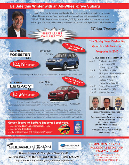 Happy New Year to you and your family! This year is going to be a great year at Ganley Subaru. Because you are from Beachwood, and so am I, you will automatically receive a GREAT DEAL. Stop on in and see us today! Oh, by the way, when you lease or buy a new Subaru, you will drive safely and stay connected to the road with Symmetrical All-Wheel Drive.