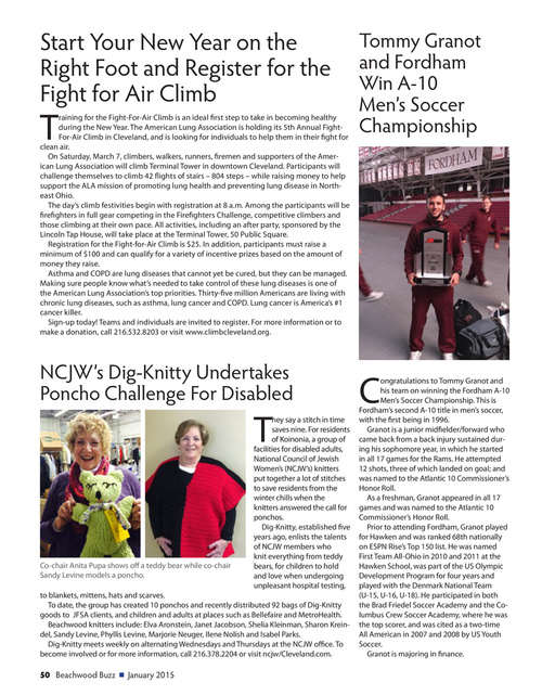 to blankets, mittens, hats and scarves. To date, the group has created 10 ponchos and recently distributed 92 bags of Dig-Knitty goods to JFSA clients, and children and adults at places such as Bellefaire and MetroHealth. Beachwood knitters include: Elva Aronstein, Janet Jacobson, Shelia Kleinman, Sharon Kreindel, Sandy Levine, Phyllis Levine, Marjorie Neuger, Ilene Nolish and Isabel Parks. Dig-Knitty meets weekly on alternating Wednesdays and Thursdays at the NCJW office. To become involved or for more information, call 216.378.2204 or visit ncjw/Cleveland.com.