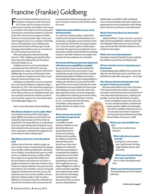 rancine (Frankie) Goldberg has been an Assistant Cuyahoga County Prosecutor for 22 years and has a proven record of protecting our families and children. She served as a member of the Major Trial Unit, prosecuted child abusers and Internet predators as director of the Ohio Internet Crimes Against Children Task Force, and prosecuted major crimes committed against seniors as a member of the Elder Abuse and Exploitation Unit. Goldberg also prosecuted hundreds of felony rape, murder and aggravated robbery cases as a member of the Community Prosecution Unit. After graduating from Beachwood High School in 1982, Goldberg attended The Ohio State University, followed by the Cleveland Marshall College of Law. Goldberg served as a University Heights councilwoman from 2002-2013; and was appointed vice-mayor, serving from 2010-2013. Additionally, she served on the boards of Hebrew Academy, Cleveland Jewish News, Fuchs Mizrachi School and Project Love. Goldberg was elected to a 2-year unexpired term as Domestic Relations Judge that began December 22, 2014. Her ceremonial swearing-in ceremony will take place January 29, 4:30 p.m., at the Old Courthouse on Lakeside Avenue, and she would be honored for residents to attend and show their support. (For more information visit GoldbergforJudge.com.) Here’s more information about Goldberg: Why did you decide to run for public office? I was involved with B’nai B’rith Youth Organization (BBYO) and student council at BHS, and worked for State Senator Lee Fisher while I attended OSU. I’ve always felt that, as an elected official, one could make positive change for issues that mattered to the community. I never wanted to be a spectator. I wanted to be engaged in my community to make it a better place. Why did you choose to run for this judicial seat? I believe that a domestic relations judge can have a major impact on protecting the integrity of our families while promoting the well-being of our children. My professional career in public service, in addition to being a mother of four, have made me recognize that healthy families and children are essential to our future. A judge’s involvement in domestic relations court is that of a dispute arbitrator who promotes the best interests of our families. I possess the good judgment, fundamental common sense, and responsiveness that must be qualities of every domestic relations judge. I hope to make a difference in the day-to-day lives of families for not only the short term, but to ensure that fair,