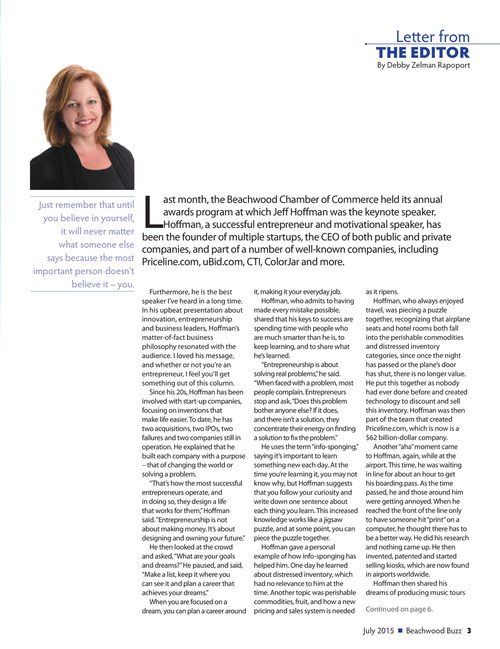 ast month, the Beachwood Chamber of Commerce held its annual Just remember that until awards program at which Jeff Hoffman was the keynote speaker. you believe in yourself, Hoffman, a successful entrepreneur and motivational speaker, has it will never matter been the founder of multiple startups, the CEO of both public and private what someone else companies, and part of a number of well-known companies, including says because the most Priceline.com, uBid.com, CTI, ColorJar and more. important person doesn’t believe it – you.
