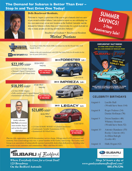 Shop 24 hours a day at www.ganleysubaruofbedford.com! August 2015 n Beachwood Buzz 15 888.470.5296