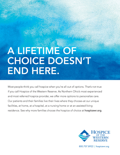 Most people think you call hospice when you’re all out of options. That’s not true if you call Hospice of the Western Reserve. As Northern Ohio’s most experienced and most referred hospice provider, we offer more options to personalize care. Our patients and their families live their lives where they choose–at our unique facilities, at home, at a hospital, at a nursing home or at an assisted living residence. See why more families choose the hospice of choice at hospicewr.org.