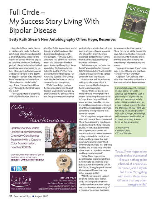 Betty Ruth Shear made friends as easily as she made the honor roll. Smart, attractive and popular, a bright future lay ahead for the would-be doctor when life began to spiral out of control. Suddenly, periods of euphoria and unbridled creativity were interrupted by sinister obsessions, suffocating panic and repeated visits to the depths of despair—as well as to a laundry list of mental health institutions. “I have been to the dark side,” says Shear. “I feared I would lose everything to the hell that was in my mind.” Forty years after her diagnosis with bipolar disorder, Shear is a Certified Public Accountant, world traveler and beloved aunt. But happiness didn’t come without struggle. From very public delusions to a deliberate head-on crash of a passenger-filled car, good Jewish girl Betty Ruth Shear reveals her frightening “gonzo ride into madness” in her new, no-holds-barred biography, Full Circle, My Success Story Living with Bipolar Disorder (as told to Joanne Fenton Humphrey). While Shear helps readers better understand the illogical logic of a world view warped by mental illness via a brutally honest, first-person recounting that periodically erupts in short, almost poetic, streams of consciousness, she also offers them the more distanced perspectives of family, friends and caregivers through included interviews. “I didn’t want you to [write the book],” younger brother Howard tells Shear candidly. “I was afraid it would bring you down to a place you don’t want to go again.” But that was a chance she was willing to take, especially if it meant she could offer insight or hope to someone else. “I know there are people out there who are looking for someone or something they can relate to,” says Shear. “Maybe if I had come across a book like this one, it would have made sense to me. I might have understood there was something wrong with me that could be helped.” For a long time, a stigma associated with mental illness prevented Shear from accepting her diagnosis and getting the help that was crucial. “If I’d had another illness like strep throat or cancer and I went to a doctor, I would welcome a diagnosis and the medication that could help make that pain go away,” explains Shear. “I had emotional pain, but a fear of being labeled and locked away wouldn’t allow me to accept the treatment and help I really needed.” Today, Shear hopes more people realize that mental illness is nothing to be ashamed of because, as her niece Janine says in Full Circle, “Struggling with mental illness is no different than any other struggle in life.” With the unwavering support of loving family, close friends and a trusted psychiatrist who “understands that human beings are complex creatures worthy of a course of treatment that takes into account the total person,” Shear has come, as the book’s title says, full circle. She has “emerged, once again, into the light,” and is thriving even after battling her way through a hysterectomy and cancer. Stronger than ever, Shear’s message is one of hope and gratitude. “I wake every day thankful.” Copies of Full Circle are available from the author and online at Amazon and other book retailers.