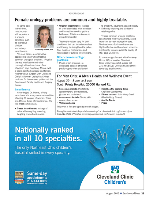 At some point in their lives, most women will experience a urologic condition, such as overactive bladder and urinary Courtenay Moore, MD incontinence. “In most cases, a conservative approach is taken when treating common urological problems. Physical therapy, medication and other nonsurgical treatments are often effective,” says Courtenay Moore, MD, a board-certified urologist and female reconstructive surgeon with Cleveland Clinic’s Glickman Urologic & Kidney Institute. Dr. Moore sees patients at the Beachwood Family Health and Surgery Center. • Urgency incontinence: leakage of urine associated with a sudden and immediate need to get to a bathroom. This is also known as overactive bladder. Treatment options vary for both conditions, but can include exercises and therapy to strengthen the pelvic floor muscles, medications and nonsurgical or surgical interventions. to childbirth, advancing age and obesity • Difficulty emptying the bladder or retaining urine “These common urologic problems can interfere with your daily life, so it’s important to seek appropriate care. The treatments for incontinence are highly effective and have been shown to significantly improve patients’ quality of life,” says Dr. Moore. To make an appointment with Courtenay Moore, MD, or another Cleveland Clinic urology specialist, please call 216.444.5600. Cleveland Clinic offers same-day appointments.