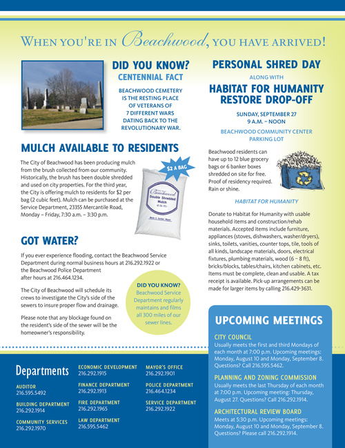 sunday, sePtemBer 27 9 a.m. – noon Beachwood community center Parking lot Beachwood residents can have up to 12 blue grocery bags or 6 banker boxes shredded on site for free. Proof of residency required. Rain or shine. habitat for humanity Donate to Habitat for Humanity with usable household items and construction/rehab materials. Accepted items include furniture, appliances (stoves, dishwashers, washer/dryers), sinks, toilets, vanities, counter tops, tile, tools of all kinds, landscape materials, doors, electrical fixtures, plumbing materials, wood (6 – 8 ft), bricks/blocks, tables/chairs, kitchen cabinets, etc. Items must be complete, clean and usable. A tax receipt is available. Pick-up arrangements can be made for larger items by calling 216.429-3631.