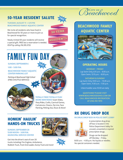 tuesday, august 11 • 6:15 Pm Beachwood family aQuatic center We invite all residents who have lived in Beachwood for 50 years or more to join us for special recognition. Newly minted 50-year residents will receive a special gift. FREE but a reservation is needed. rSVP by calling 216.595.3733.