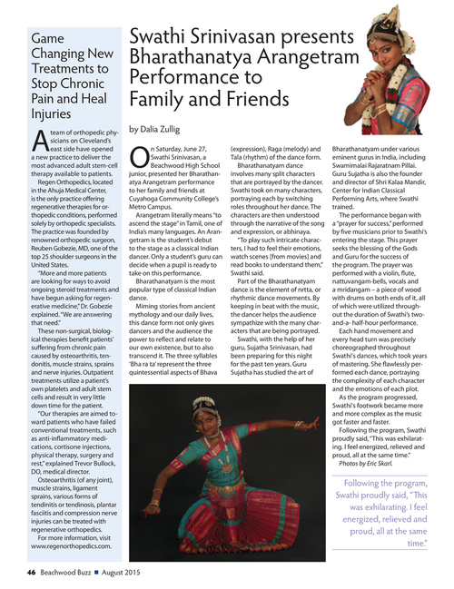 n Saturday, June 27, Swathi Srinivasan, a Beachwood High School junior, presented her Bharathanatya Arangetram performance to her family and friends at Cuyahoga Community College’s Metro Campus. Arangetram literally means “to ascend the stage” in Tamil, one of India’s many languages. An Arangetram is the student’s debut to the stage as a classical Indian dancer. Only a student’s guru can decide when a pupil is ready to take on this performance. Bharathanatyam is the most popular type of classical Indian dance. Miming stories from ancient mythology and our daily lives, this dance form not only gives dancers and the audience the power to reflect and relate to our own existence, but to also transcend it. The three syllables ‘Bha ra ta’ represent the three quintessential aspects of Bhava