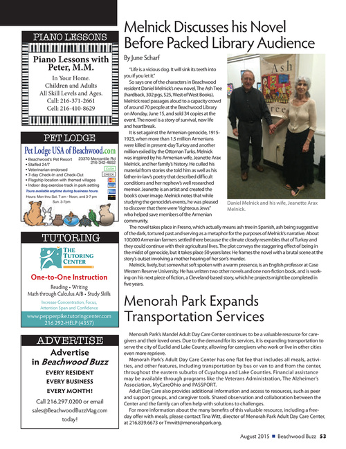 “Life is a vicious dog. It will sink its teeth into you if you let it.” So says one of the characters in Beachwood resident Daniel Melnick’s new novel, The Ash Tree (hardback, 302 pgs, $25, West of West Books). Melnick read passages aloud to a capacity crowd of around 70 people at the Beachwood Library on Monday, June 15, and sold 34 copies at the event. The novel is a story of survival, new life and heartbreak. It is set against the Armenian genocide, 19151923, when more than 1.5 million Armenians were killed in present-day Turkey and another million exiled by the Ottoman Turks. Melnick was inspired by his Armenian wife, Jeanette Arax Melnick, and her family’s history. He culled his material from stories she told him as well as his father-in-law’s poetry that described difficult conditions and her nephew’s well researched memoir. Jeanette is an artist and created the book’s cover image. Melnick notes that while studying the genocide’s events, he was pleased Daniel Melnick and his wife, Jeanette Arax to discover that there were “righteous Jews” Melnick. who helped save members of the Armenian community. The novel takes place in Fresno, which actually means ash tree in Spanish, ash being suggestive of the dark, tortured past and serving as a metaphor for the purposes of Melnick’s narrative. About 100,000 Armenian farmers settled there because the climate closely resembles that of Turkey and they could continue with their agricultural lives. The plot conveys the staggering effect of being in the midst of genocide, but it takes place 50 years later. He frames the novel with a brutal scene at the story’s outset involving a mother hearing of her son’s murder. Melnick, lively, but somewhat soft spoken with a warm presence, is an English professor at Case Western Reserve University. He has written two other novels and one non-fiction book, and is working on his next piece of fiction, a Cleveland-based story, which he projects might be completed in five years.