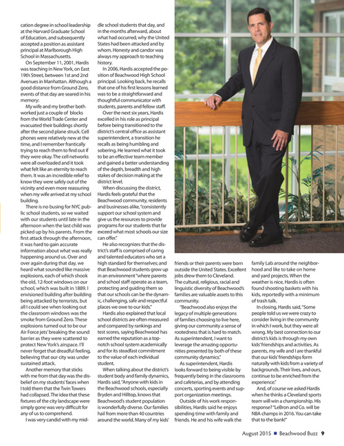 dle school students that day, and in the months afterward, about what had occurred, why the United States had been attacked and by whom. Honesty and candor was always my approach to teaching history. In 2006, Hardis accepted the position of Beachwood High School principal. Looking back, he recalls that one of his first lessons learned was to be a straightforward and thoughtful communicator with students, parents and fellow staff. Over the next six years, Hardis excelled in his role as principal before being transitioned to the district’s central office as assistant superintendent, a transition he recalls as being humbling and sobering. He learned what it took to be an effective team member and gained a better understanding of the depth, breadth and high stakes of decision making at the district level. When discussing the district, Hardis feels grateful that the Beachwood community, residents and businesses alike, “consistently support our school system and give us the resources to provide programs for our students that far exceed what most schools our size can offer.” He also recognizes that the district’s staff is comprised of caring and talented educators who set a high standard for themselves; and that Beachwood students grow up in an environment “where parents and school staff operate as a team, protecting and guiding them so that our schools can be the dynamic, challenging, safe and respectful places we owe to our kids.” Hardis also explained that local school districts are often measured and compared by rankings and test scores, saying Beachwood has earned the reputation as a topnotch school system academically and for its steadfast commitment to the value of each individual student. When talking about the district’s student body and family dynamics, Hardis said, ‘’Anyone with kids in the Beachwood schools, especially Bryden and Hilltop, knows that Beachwood’s student population is wonderfully diverse. Our families hail from more than 40 countries around the world. Many of my kids’