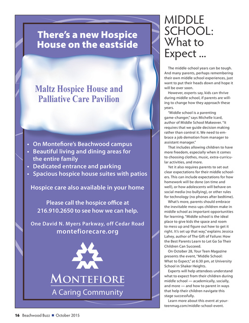 • On Montefiore’s Beachwood campus • Beautiful living and dining areas for the entire family • Dedicated entrance and parking • Spacious hospice house suites with patios