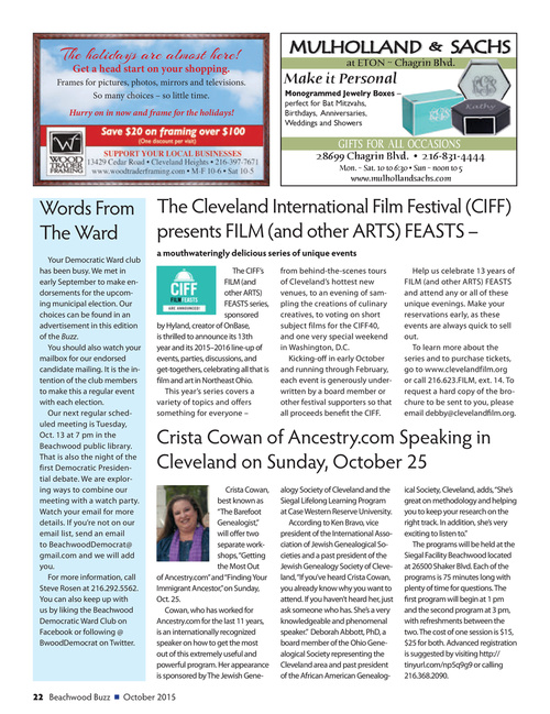 Your Democratic Ward club has been busy. We met in early September to make endorsements for the upcoming municipal election. Our choices can be found in an advertisement in this edition of the Buzz. You should also watch your mailbox for our endorsed candidate mailing. It is the intention of the club members to make this a regular event with each election. Our next regular scheduled meeting is Tuesday, Oct. 13 at 7 pm in the Beachwood public library. That is also the night of the first Democratic Presidential debate. We are exploring ways to combine our meeting with a watch party. Watch your email for more details. If you’re not on our email list, send an email to BeachwoodDemocrat@ gmail.com and we will add you. For more information, call Steve Rosen at 216.292.5562. You can also keep up with us by liking the Beachwood Democratic Ward Club on Facebook or following @ BwoodDemocrat on Twitter.
