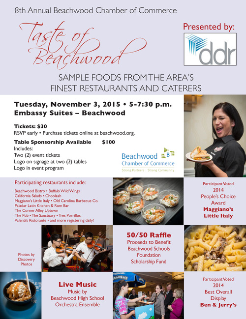 Tickets: $30 RSVP early • Purchase tickets online at beachwood.org. Table Sponsorship Available Includes: Two (2) event tickets Logo on signage at two (2) tables Logo in event program Participating restaurants include: