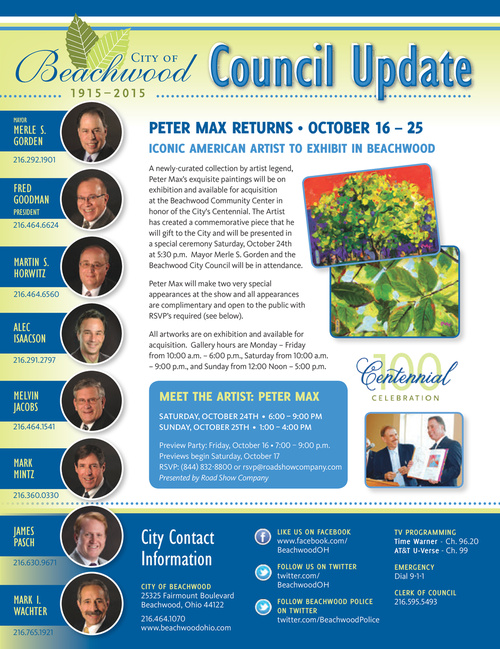 A newly-curated collection by artist legend, Peter Max’s exquisite paintings will be on exhibition and available for acquisition at the Beachwood Community Center in honor of the City's Centennial. The Artist has created a commemorative piece that he will gift to the City and will be presented in a special ceremony Saturday, October 24th at 5:30 p.m. Mayor Merle S. Gorden and the Beachwood City Council will be in attendance. Peter Max will make two very special appearances at the show and all appearances are complimentary and open to the public with RSVP’s required (see below). All artworks are on exhibition and available for acquisition. Gallery hours are Monday – Friday from 10:00 a.m. – 6:00 p.m., Saturday from 10:00 a.m. – 9:00 p.m., and Sunday from 12:00 Noon – 5:00 p.m.