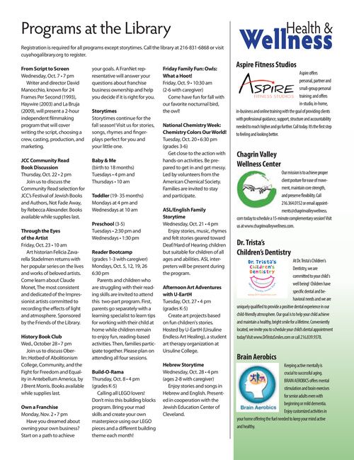Registration is required for all programs except storytimes. Call the library at 216-831-6868 or visit cuyahogalibrary.org to register. From Script to Screen Wednesday, Oct. 7 • 7 pm Writer and director David Manocchio, known for 24 Frames Per Second (1993), Haywire (2003) and La Bruja (2009), will present a 2-hour independent filmmaking program that will cover writing the script, choosing a crew, casting, production, and marketing. JCC Community Read Book Discussion Thursday, Oct. 22 • 2 pm Join us to discuss the Community Read selection for JCC’s Festival of Jewish Books and Authors, Not Fade Away, by Rebecca Alexander. Books available while supplies last. Through the Eyes of the Artist Friday, Oct. 23 • 10 am Art historian Felicia Zavarella Stadelmen returns with her popular series on the lives and works of beloved artists. Come learn about Claude Monet, The most consistent and dedicated of the Impressionist artists committed to recording the effects of light and atmosphere. Sponsored by the Friends of the Library. History Book Club Wed., October 28 • 7 pm Join us to discuss Oberlin: Hotbed of Abolitionism College, Community, and the Fight for Freedom and Equality in Antebellum America, by J Brent Morris. Books available while supplies last. Own a Franchise Monday, Nov. 2 • 7 pm Have you dreamed about owning your own business? Start on a path to achieve your goals. A FranNet representative will answer your questions about franchise business ownership and help you decide if it is right for you. Storytimes Storytimes continue for the fall season! Visit us for stories, songs, rhymes and fingerplays perfect for you and your little one. Baby & Me (birth to 18 months) Tuesdays • 4 pm and Thursdays • 10 am Toddler (19- 35 months) Mondays at 4 pm and Wednesdays at 10 am Preschool (3-5) Tuesdays • 2:30 pm and Wednesdays • 1:30 pm Reader Bootcamp (grades 1-3 with caregiver) Mondays, Oct. 5, 12, 19, 26 6:30 pm Parents and children who are struggling with their reading skills are invited to attend this two-part program. First, parents go separately with a learning specialist to learn tips for working with their child at home while children remain to enjoy fun, reading-based activities. Then, families participate together. Please plan on attending all four sessions. Build-O-Rama Thursday, Oct. 8 • 4 pm (grades K-5) Calling all LEGO lovers! Don’t miss this building blocks program. Bring your mad skills and create your own masterpiece using our LEGO pieces and a different building theme each month! Friday Family Fun: Owls: What a Hoot! Friday, Oct. 9 • 10:30 am (2-6 with caregiver) Come have fun for fall with our favorite nocturnal bird, the owl! National Chemistry Week: Chemistry Colors Our World! Tuesday, Oct. 20 • 6:30 pm (grades 3-6) Get close to the action with hands-on activities. Be prepared to get in and get messy. Led by volunteers from the American Chemical Society. Families are invited to stay and participate. ASL/English Family Storytime Wednesday, Oct. 21 • 4 pm Enjoy stories, music, rhymes and felt stories geared toward Deaf/Hard of Hearing children but suitable for children of all ages and abilities. ASL interpreters will be present during the program. Afternoon Art Adventures with U-EartH Tuesday, Oct. 27 • 4 pm (grades K-5) Create art projects based on fun children's stories. Hosted by U-EartH (Ursuline Endless Art Healing), a student art therapy organization at Ursuline College.