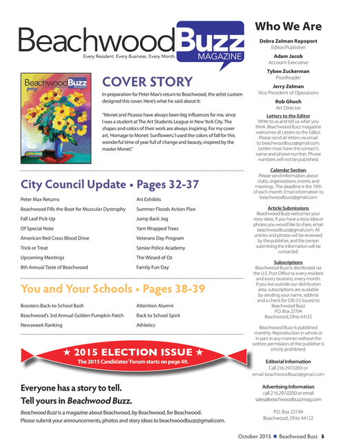 Letters to the Editor Write to us and tell us what you think. Beachwood Buzz magazine welcomes all Letters to the Editor. Please send all letters via email to beachwoodbuzz@gmail.com. Letters must have the contact’s name and phone number. Phone numbers will not be published. Calendar Section Please send information about clubs, organizations, events and meetings. The deadline is the 10th of each month. Email information to beachwoodbuzz@gmail.com Article Submissions Beachwood Buzz welcomes your story ideas. If you have a story idea or photos you would like to share, email beachwoodbuzz@gmail.com. All articles and photos will be reviewed by the publisher, and the person submitting the information will be contacted. Subscriptions Beachwood Buzz is distributed via the U.S. Post Office to every resident and every business, every month. If you live outside our distribution area, subscriptions are available by sending your name, address and a check for $30 (12 issues) to Beachwood Buzz P.O. Box 22194 Beachwood, Ohio 44122 Beachwood Buzz is published monthly. Reproduction in whole or in part in any manner without the written permission of the publisher is strictly prohibited.