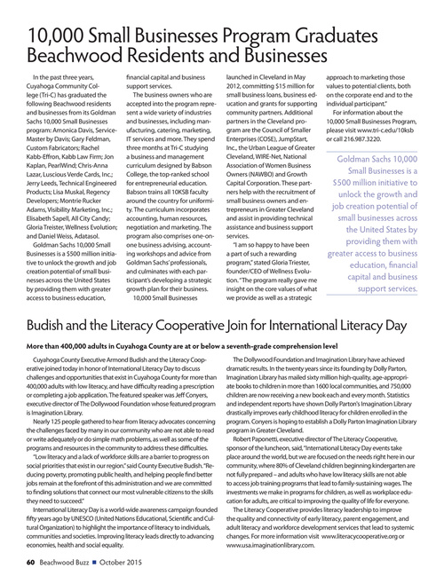 In the past three years, Cuyahoga Community College (Tri-C) has graduated the following Beachwood residents and businesses from its Goldman Sachs 10,000 Small Businesses program: Amonica Davis, ServiceMaster by Davis; Gary Feldman, Custom Fabricators; Rachel Kabb-Effron, Kabb Law Firm; Jon Kaplan, PearlWind; Chris-Anna Lazar, Luscious Verde Cards, Inc.; Jerry Leeds, Technical Engineered Products; Lisa Muskal, Regency Developers; Montrie Rucker Adams, Visibility Marketing, Inc.; Elisabeth Sapell, All City Candy; Gloria Treister, Wellness Evolution; and Daniel Weiss, Adatasol. Goldman Sachs 10,000 Small Businesses is a $500 million initiative to unlock the growth and job creation potential of small businesses across the United States by providing them with greater access to business education, financial capital and business support services. The business owners who are accepted into the program represent a wide variety of industries and businesses, including manufacturing, catering, marketing, IT services and more. They spend three months at Tri-C studying a business and management curriculum designed by Babson College, the top-ranked school for entrepreneurial education. Babson trains all 10KSB faculty around the country for uniformity. The curriculum incorporates accounting, human resources, negotiation and marketing. The program also comprises one-onone business advising, accounting workshops and advice from Goldman Sachs’ professionals, and culminates with each participant’s developing a strategic growth plan for their business. 10,000 Small Businesses launched in Cleveland in May 2012, committing $15 million for small business loans, business education and grants for supporting community partners. Additional partners in the Cleveland program are the Council of Smaller Enterprises (COSE), JumpStart, Inc., the Urban League of Greater Cleveland, WIRE-Net, National Association of Women Business Owners (NAWBO) and Growth Capital Corporation. These partners help with the recruitment of small business owners and entrepreneurs in Greater Cleveland and assist in providing technical assistance and business support services. “I am so happy to have been a part of such a rewarding program,” stated Gloria Triester, founder/CEO of Wellness Evolution. “The program really gave me insight on the core values of what we provide as well as a strategic approach to marketing those values to potential clients, both on the corporate end and to the individual participant.” For information about the 10,000 Small Businesses Program, please visit www.tri-c.edu/10ksb or call 216.987.3220.