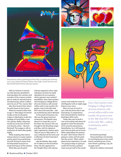 industry expand to a four-color web press, he knew he could reproduce his art as posters, which opened a new world of possibilities. Soon, Max’s posters were hanging in college dorms all across America, with several million sold in nine months. His posters were to the ‘60s what MTV was to the early ‘80s – radical, revolutionary and in demand. To the youth of America, the ‘60s was the great American renaissance. The Beatles sang about it in songs like Lucy in the Skies; the musical, Hair was brought to the Broadway stage; and Max, with his signature style, captured its creative spirit. “Pop art was in,” Max told us. “It was a reflection of the times and a reflection of what I learned in art school.” Like the Beatles, Max made his TV debut on the Ed Sullivan Show. He also appeared on the Tonight Show with Johnny